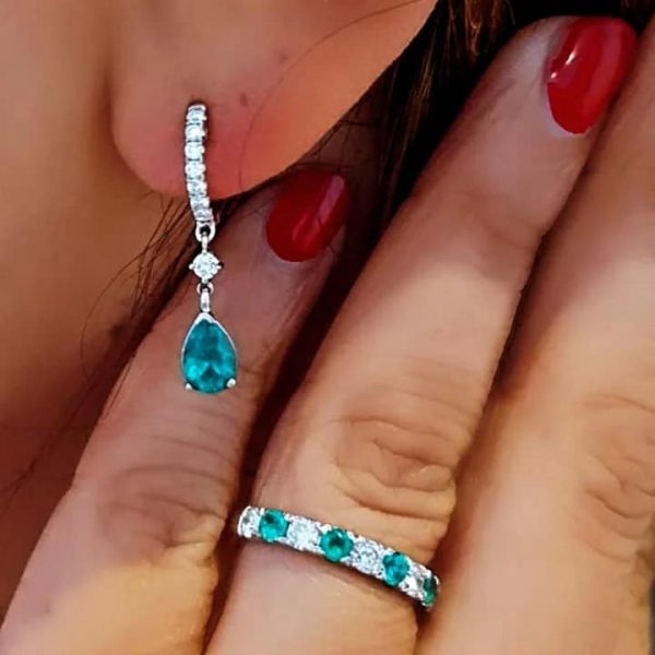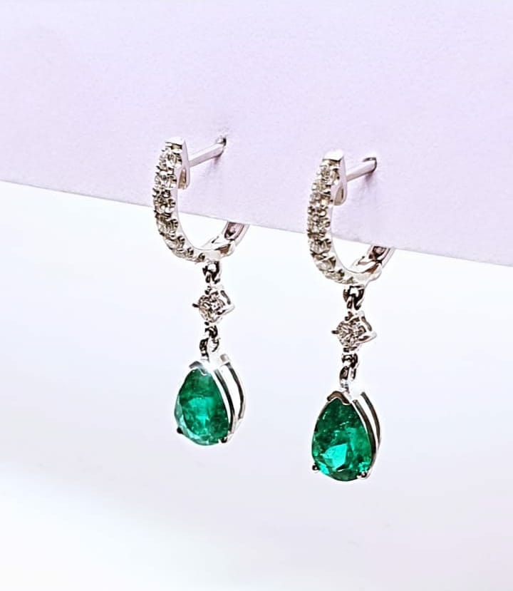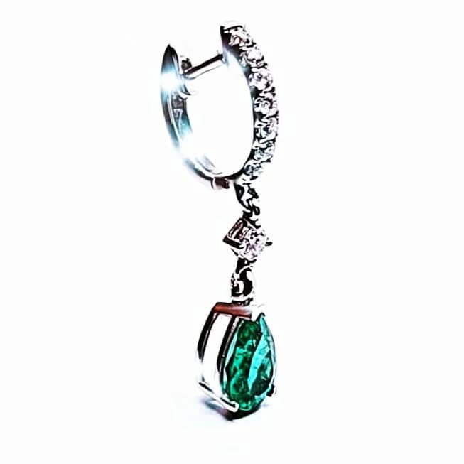 Candongas oro blanco 18 k con diamante y esmeralda talla lagrima